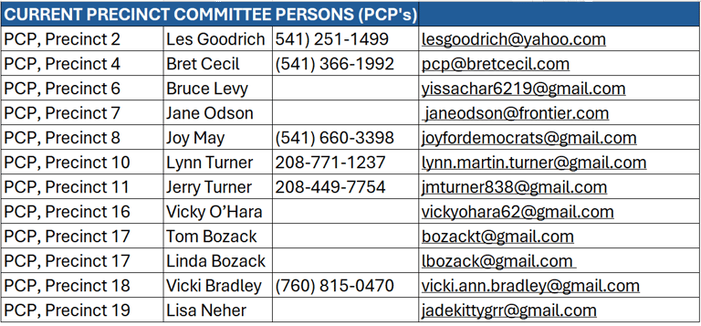 The Curry County Democrats membership is made up of all Democratic Precinct Committee Persons (PCPs) elected or appointed in Curry County and any Democratic legislator who lives in and is a PCP of another county and who represents a portion of Curry County.